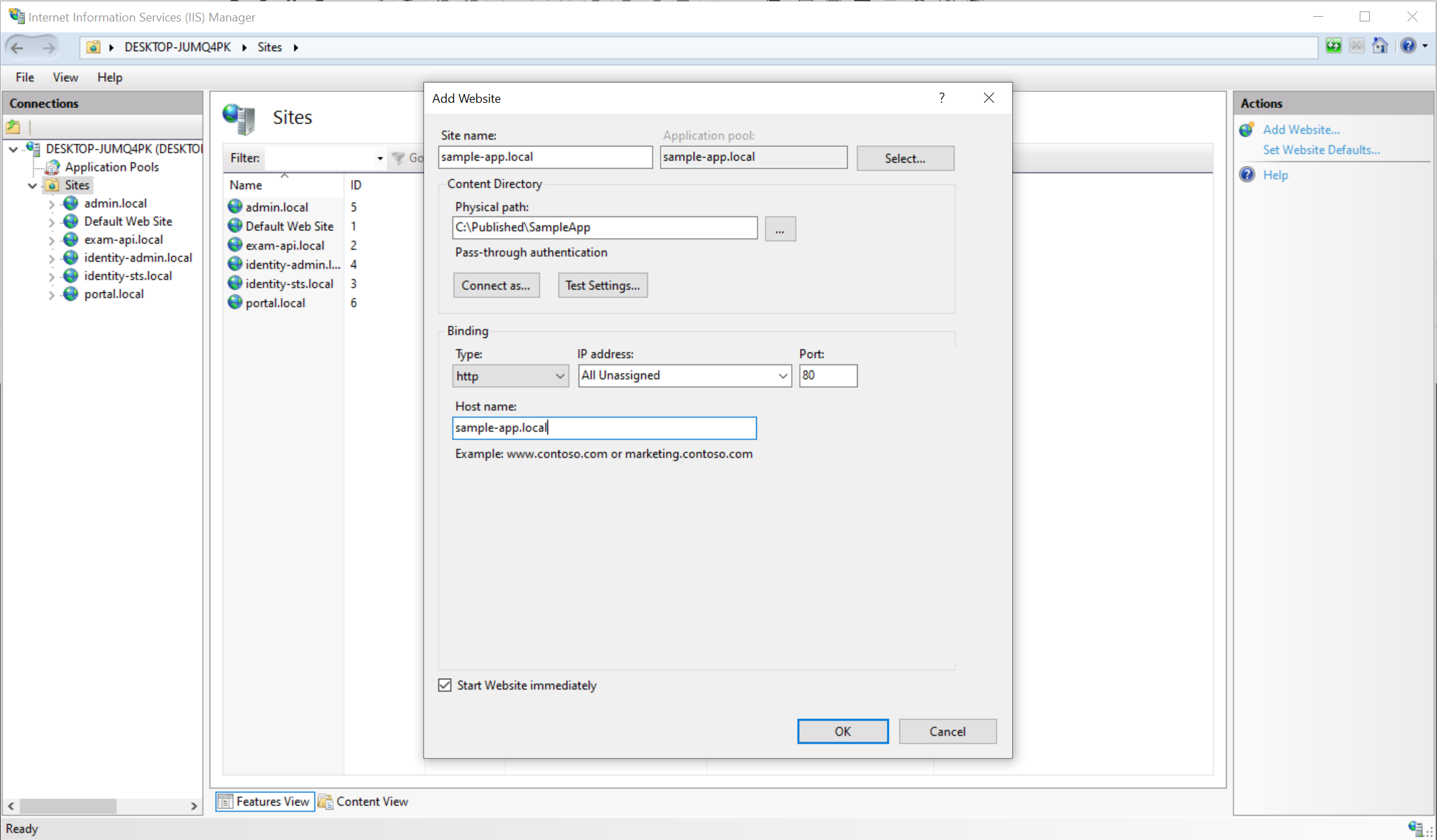 Bước 2: Tạo mới website và binding cổng 80 với domain đó như bình thường